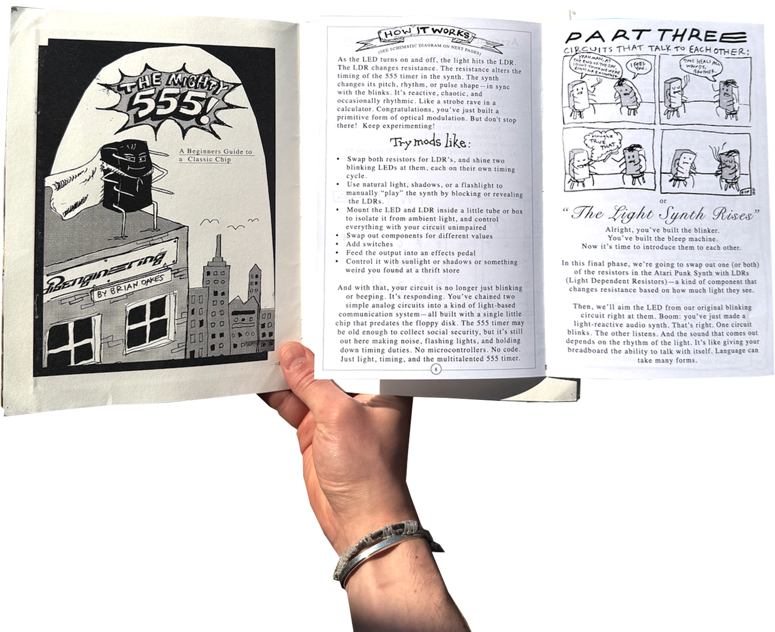Each project comes with a corresponding fold-out workbook, complete with both detailed technical illustrations and totally tangential comics.